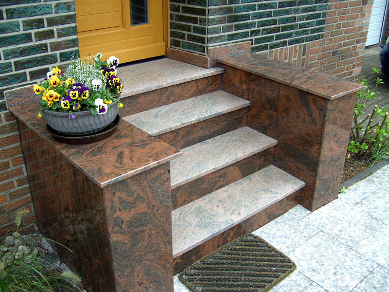 Außentreppe aus Multicolor Red geflammt / Stöße und Ablagen aus Multicolor poliert
